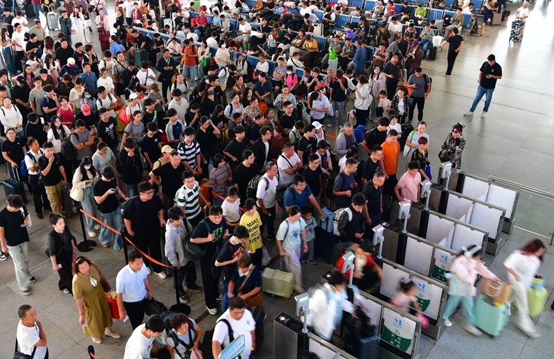 9月29日,旅客在江苏无锡站候车大厅排队检票。