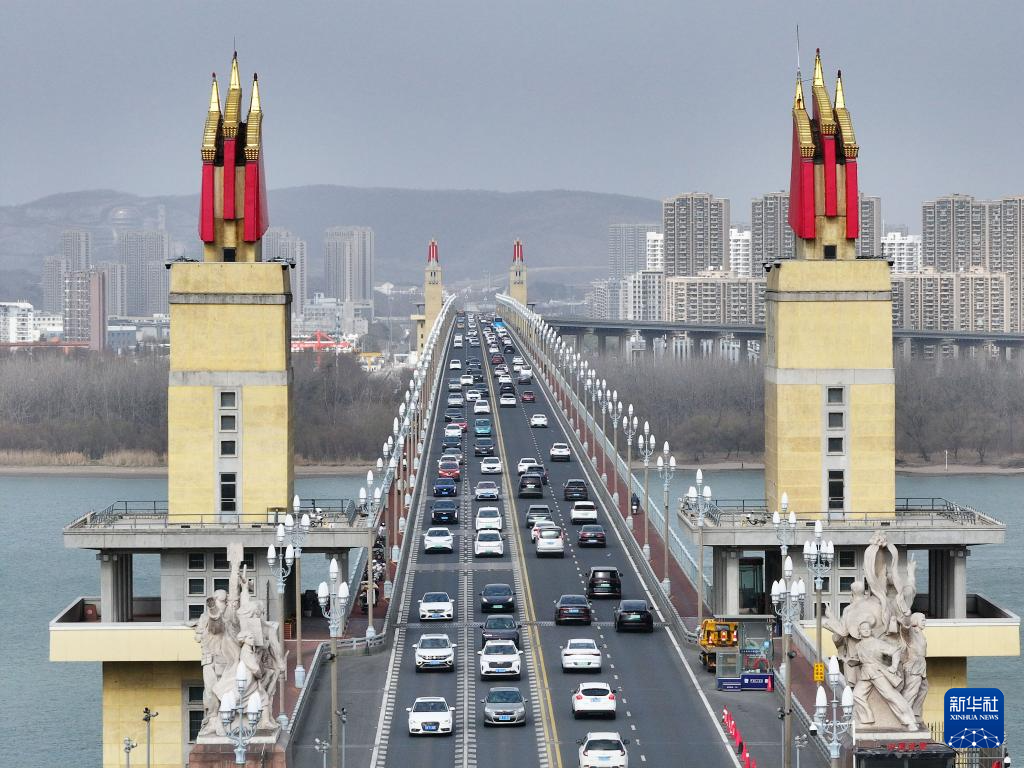 这是2月23日拍摄的南京长江大桥上的车流(无人机照片)。